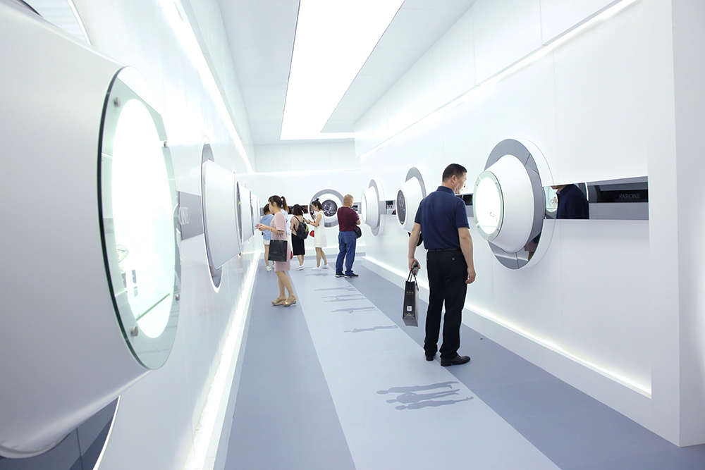 今年的雷諾表展館展臺以波浪形的表帶及表盤合成抽象的圓形表盤,并配以燈光,極具視覺沖擊力,白色的線條猶如鋼琴的琴鍵,流暢而優美,環繞展臺四周,時間與優雅的生活完美融合,并在入口處設置時光隧道,光影穿梭,引領全新的商務體驗和潮流。展館內的流水幕墻,寓意著時光的流動完美融合其中,展示效果更為生動。