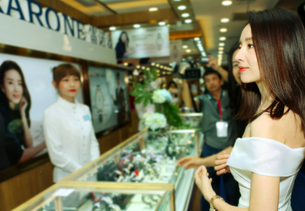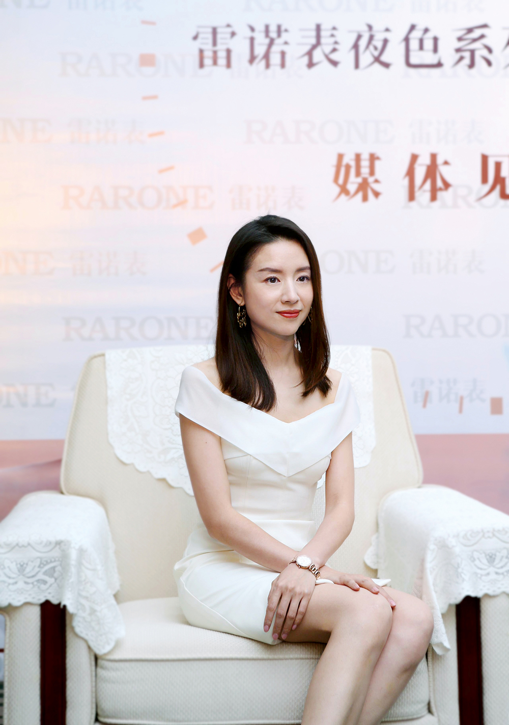 優雅女神董潔一身梨白小禮服驚喜現身雷諾表專柜,一同品鑒雷諾新品腕表。