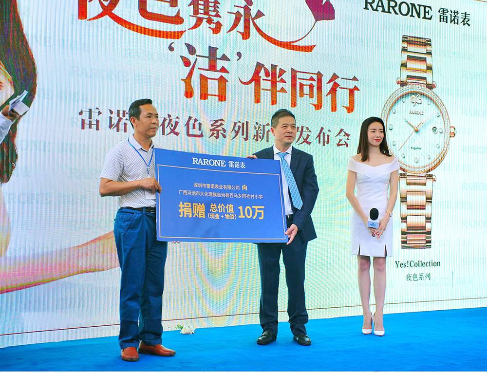 女神表示自己也非常喜歡這款新品傳達的永恒主題,表款的設計也很有意思,會是當下都市女性青睞的腕間配飾。值得一提的是,一直熱心公益事業的雷諾表,在本次發布會上邀請董潔一同見證品牌方為廣西河池市大化瑤族自治縣百馬鄉同社村小學開展的愛心助學捐贈,在當地媒體以及明星董潔的見證下,雷諾表為貧困小學捐贈10萬愛心物資及義款,用有溫度的時間將一顆顆愛心傳遞,溫暖每一個需要幫助的孩子。