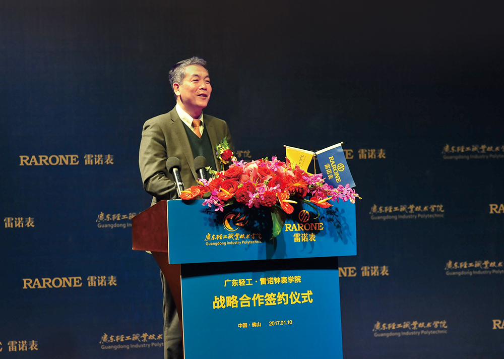 1月10日上午,廣東輕院·雷諾鐘表學院校企戰略合作簽約儀式暨揭牌儀式,在廣東輕工職業技術學院隆重召開,原航空航天工業部部長、深圳工業總會高級顧問林宗棠,中國鐘表協會理事長陶小年,廣東輕院黨委書記杜安國,廣東輕院校長盧坤建,廣東省人民政府參事、深圳工業總會執行主席王肇文,廣東省鐘表協會會長陳紅弟,雷諾表業董事長詹西洲、雷諾表業總經理詹江洲以及各大主流媒體悉數登場,共同見證全國首個鐘表行業人才培訓基地的誕生。