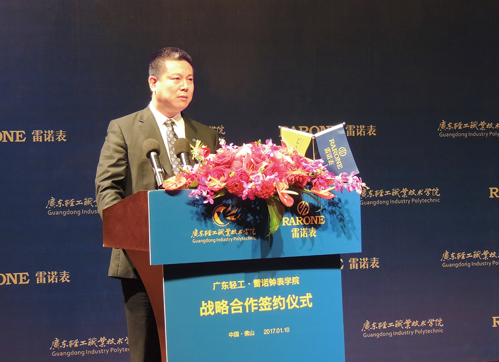 活動當天,校方、協會代表以及企業代表就創新校企鐘表專業共建、人才培養模式改革發表了重要講話。 作為本次校企合作的企業代表,雷諾表業董事長詹西洲先生在大會上表示:“本次校企合作,雷諾表業將最大力度發揮企業作用,參與到鐘表技術人才培養的全過程,實現校企協同育人,并通過產教融合、工學交替、資源共享、信息互通,推進多領域、多層次、多形式合作,達到校企全面推進高精人才培養與經濟發展的契合度和辦學水平。”