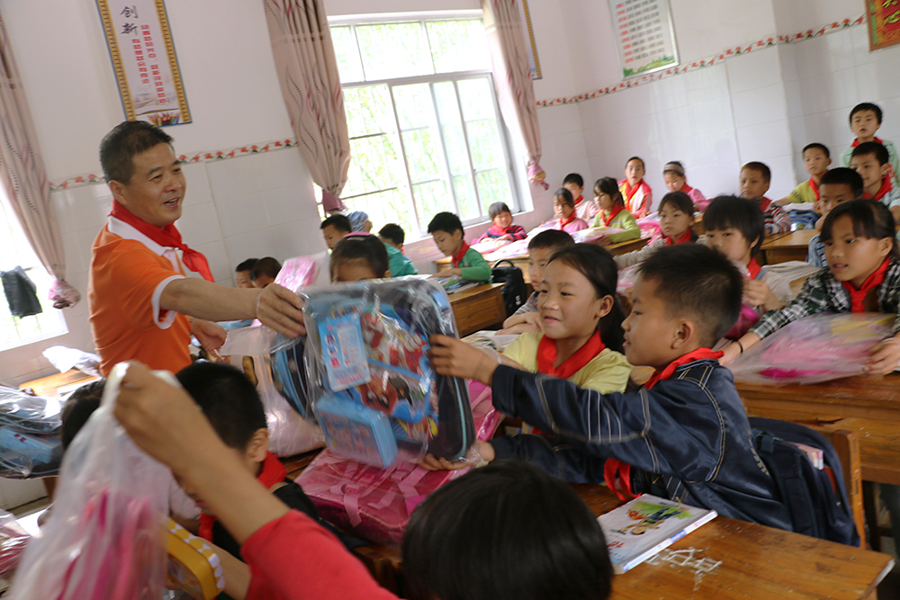 在同社村小學校長的帶領下,我們的愛心小組參觀了孩子們的教室和宿舍,校長說這里很多孩子每天要走路最少一、兩個小時來上課,條件很艱苦,但孩子們學習的積極性很高,也非常懂事。看著孩子們的住宿環(huán)境,我們心里有說不出的滋味。當我們拿出為孩子們準備的新書包時,孩子們的眼里有光,詹總親自給每一位孩子送上新書包,孩子們露出了純真的笑臉。